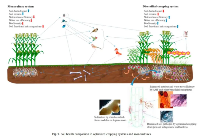 新作物多樣化與有益的交流能力的改善土壤生物可能是一個新的角度對提高農(nóng)作物產(chǎn)量,改善土壤養(yǎng)分利用效率,并減少農(nóng)業(yè)投入成本和人工化學應用的環(huán)境影響,從而導致更好的土壤健康和可持續(xù)農(nóng)業(yè)生態(tài)系統(tǒng)。
